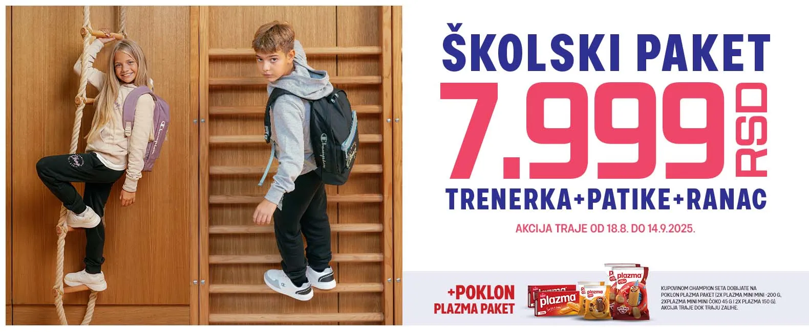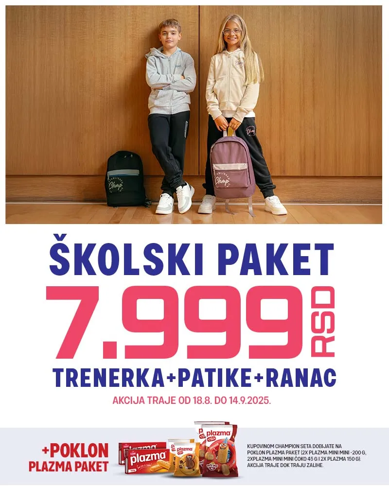 Obucite se od glave do pete uz naše Champion pakete – trenerka, patike i ranac po izboru za neverovatnu cenu od samo 7.999 RSD.