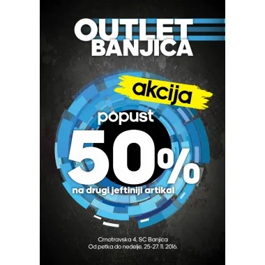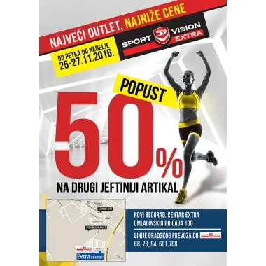 Sport Vision u svojim outlet prodavnicama organizuje od 25. do 27. novembra 2016. godine veliku akciju u kojoj za kupovinu dva artikla dobijate sniženje 50% na drugi artikal.