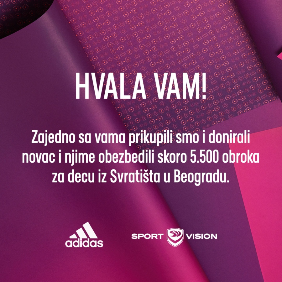 Godinu za nama obeležili smo brojnim uspesima, ali ono na šta smo najviše ponosni jeste humanitarna akcija prikupljanja sredstava za Centar za integraciju mladih koju smo organizovali u saradnji sa brendom Adidas. Ništa od ovoga ne bi bilo moguće da nije bilo vas, zbog čega vam ovim putem kažemo jedno veliko HVALA. Od svake online kupovine adidas artikala izdvojili smo 10% za donaciju, a svim potrošačima uzvratili smo malim znakom pažnje – ukrasom za jelku koju smo slali uz svaku porudžbinu. U periodu od 13. do 31. decembra sakupili smo 10. 950 evra koje smo donirali svratištu u Krfskoj ulici u Beogradu, a što je dovoljno da se obezbedi skoro 5.500 obroka za decu koja tamo borave.